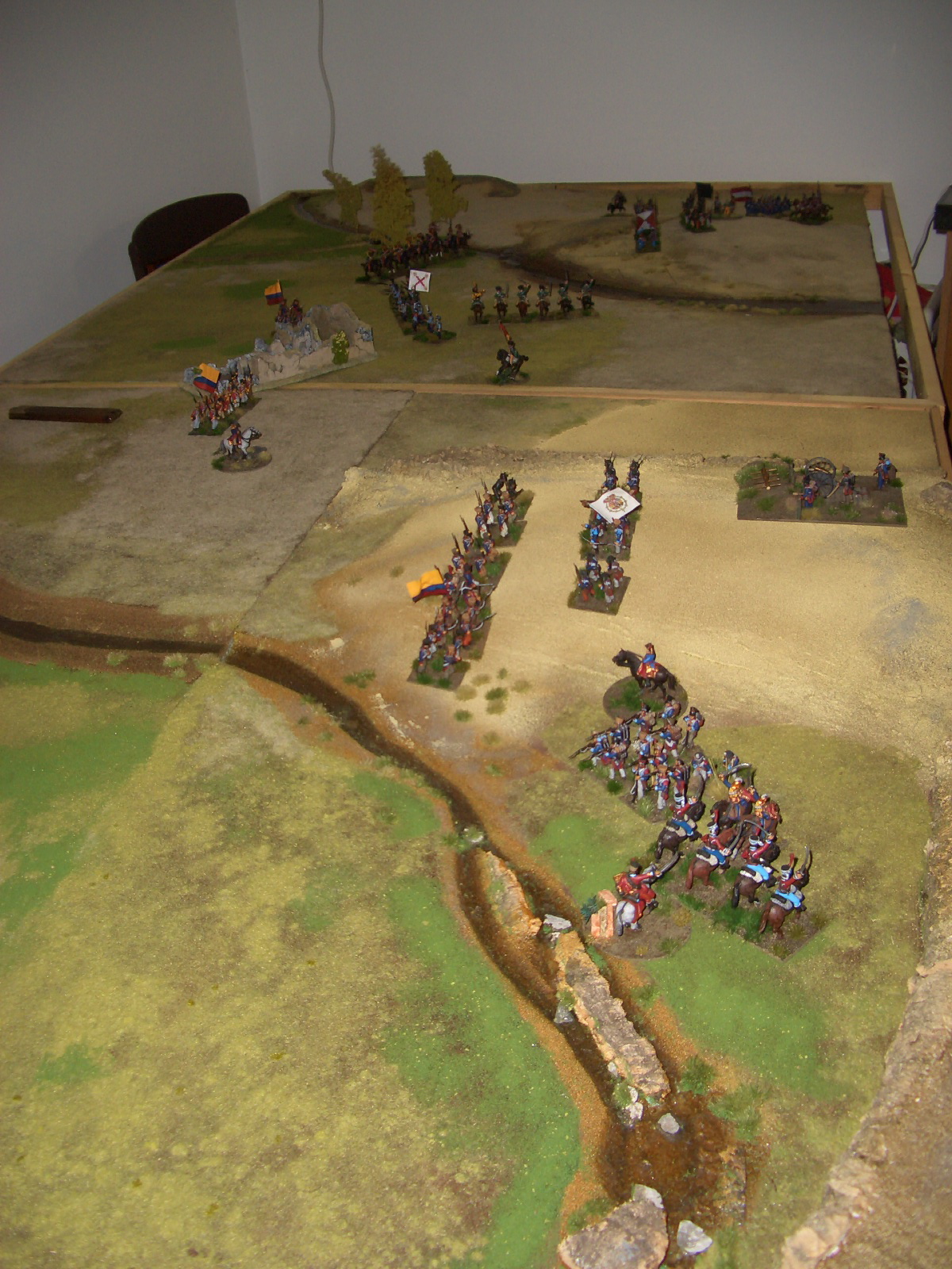 On my right flank the Venezuelan & Colombian cavalry brigade advanced at their fastest pace to attempt to outflank the opposing Royalist Aragon & Cantabria Regiments whilst my sole artillery piece offered long range support.